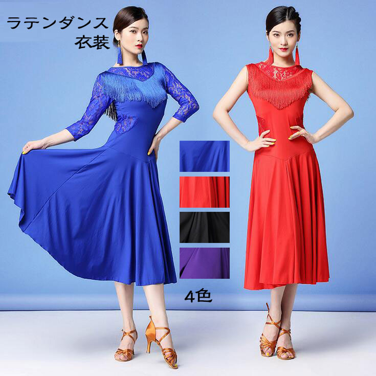ダンス衣装 ロング丈ダンスドレス ラテンダンス衣装 社交ダンス モダンダンス ラテンドレス ワンピース レース ダンスウェア フリンジ 七分袖 袖無し ノースリーブ ラテン競技着