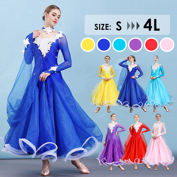 社交ダンス衣装 社交ダンスドレス 初心者 ワンピース 高級 豪華 競技着 練習着 スタンダード 大合唱 ボールルーム衣装 モダンドレス 競技ダンス ラテン 開場ドレス 発表会 広がる裾 赤 黄 演出服