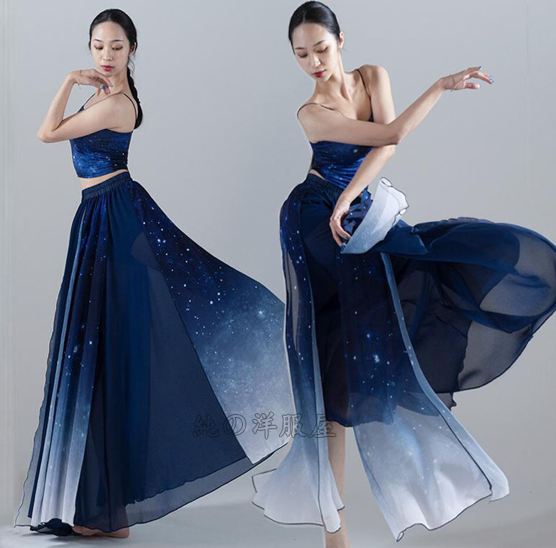 レディースグラデーションダンス衣装 単品 セット選べる 夜空 星空 古典舞踊ダンス衣装 キャミソール 大きい裾広がるスカート 飄逸 古典ダンス モダンダンス 社交ダンス 練習着