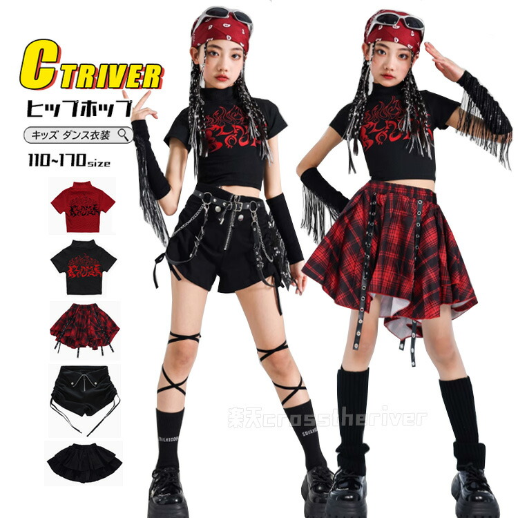スカート チェック柄 赤 k-pop 衣装 キッズ へそ出し トップス ダンス衣装 セットアップ ヒップホップ 女の子 袖カバー 黒シャツ レッグカバー 韓国 アイドル ハーフパンツ