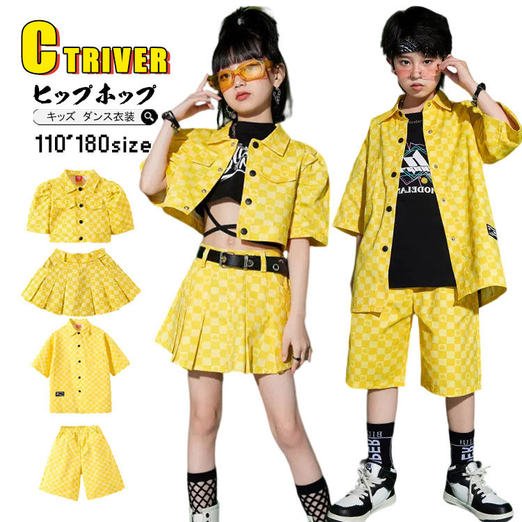 k-pop 衣装 イエロー チェック柄 キッズダンス衣装 セットアップ ヒップホップ キッズ へそ出し トップス 女の子 チアガール プリーツスカート 黄色 シャツ 半袖 短パンツ チアダンス 男の子
