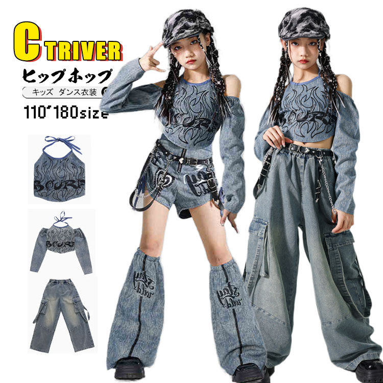 k-pop 衣装 青 デニム キッズダンス衣装 セットアップ ヒップホップ へそ出し トップス 女の子 オフショルダー ベスト デニムパンツ アイドル 短パンツ レッグカバー 韓国