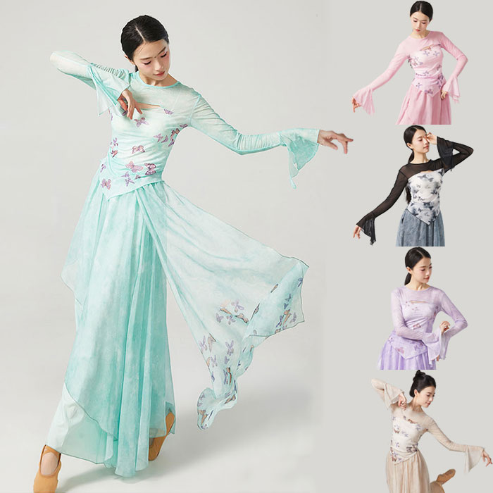 超美しいレディース古典ダンス衣装 新作 上下セット 蝶柄 全5色 トップス フレア袖 シースルー ワイドパンツ 飄逸なスカパン 二重シフォン バイカラー レッスン着 練功服 エレガント 中国古典舞踊