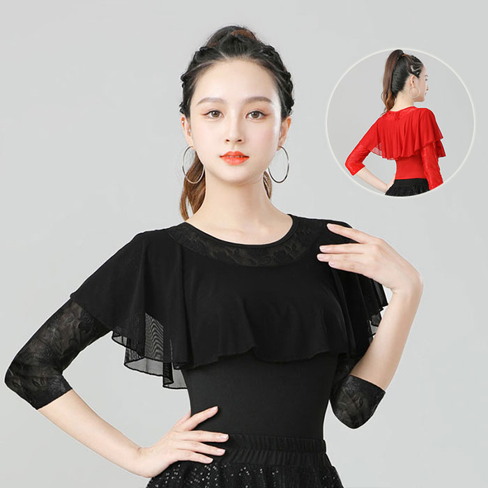 ダンストップス レディース 社交ダンス衣装 トップス 七分袖 花レース シースルー 胸元フリル チュール ラテンダンス モダンダンス 飄逸なダンス衣装 バレエ ジャズ 練習着 上着 競技着 レッ 女性