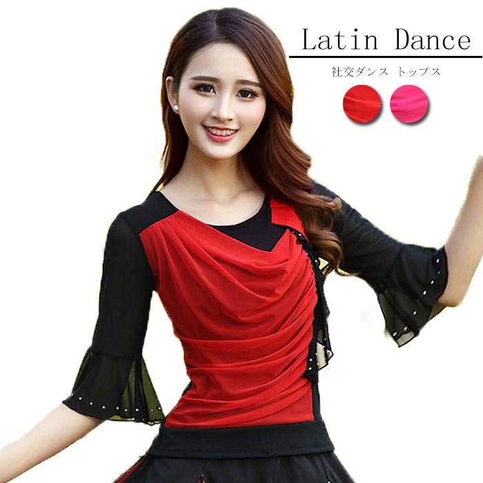 社交ダンス衣装 女性 上着 トップス レディース 透け感あり 練習着 競技着 ダンスウェア 競技ダンス レッスン ラテンダンス モダンダンス 発表会用 黒 レッド 赤 肌見せ ワルツ チ ボリューム袖