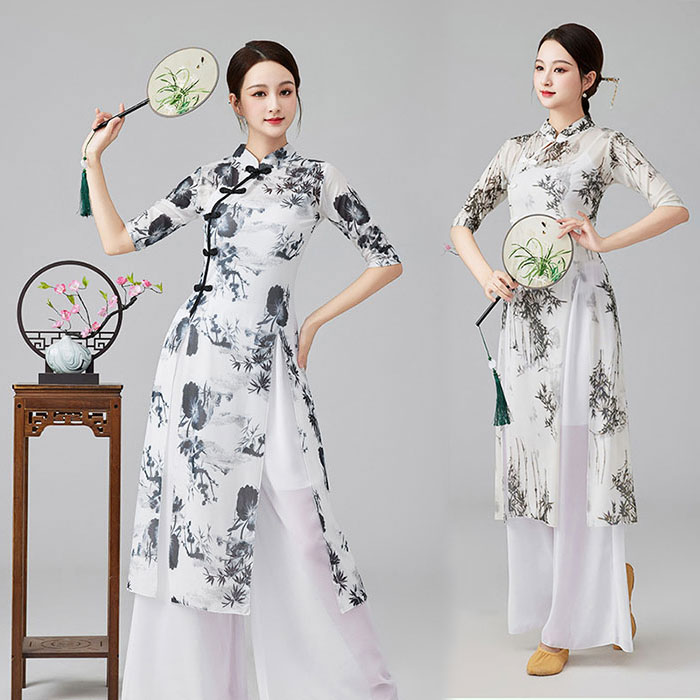 古典ダンス衣装 上下セット ダンス トップス ブラウス チャイナドレス シースル スリット キャミソール ワイドパンツ 花柄 竹柄 チャイナ風 練功服 ダンスウェア 舞台衣装 発表会 練習着 古典舞踊