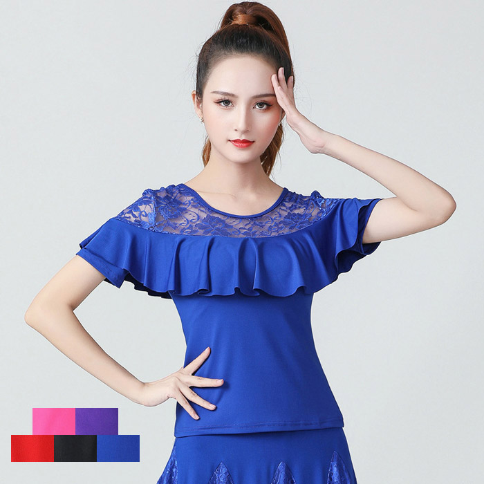ダンストップス 社交ダンス 衣装 花レース フリル 半袖トップス ダンス衣装 レッスン着 ラテンダンス モダンダンス ダンスウェア 練習着 ダンス着 シースルー レッス コーラス衣装