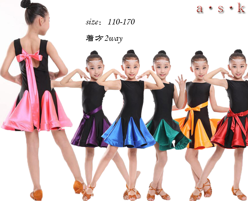 ラテン ダンス衣装 子供 女の子 ラテンドレス スカラップ フレアドレス 色スプライス ラテンダンス専門服 舞台 演出服 練習着 ストレッチ リボン ステージ衣装 6色 11 着方2way
