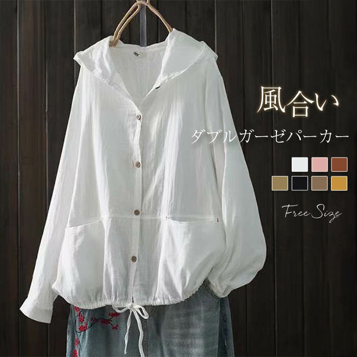 クーポンで2780円 ガーゼ パーカー レディース 長袖 春 夏 ダブルガーゼ 無地 ボタン ガーゼパーカー ガーゼカーディガン 前開き フード シャツ トップス ジャケット カジ ブラウス