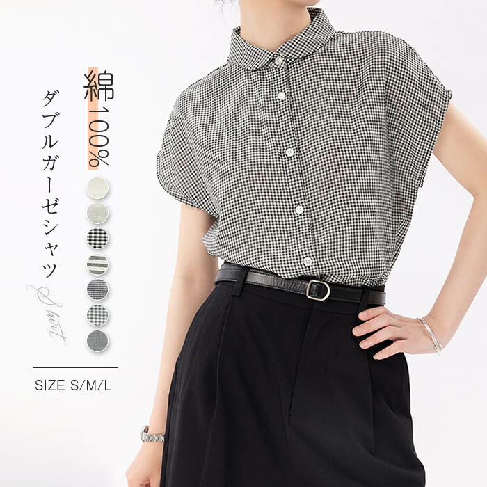 8色 ガーゼシャツ 綿100% シャツブラウス レディース 丸襟 シャツ ブラウス トップス フレンチスリーブ カジュアル 無地 チェック ストライプ 千鳥柄 大きいサイズ 体型カバー