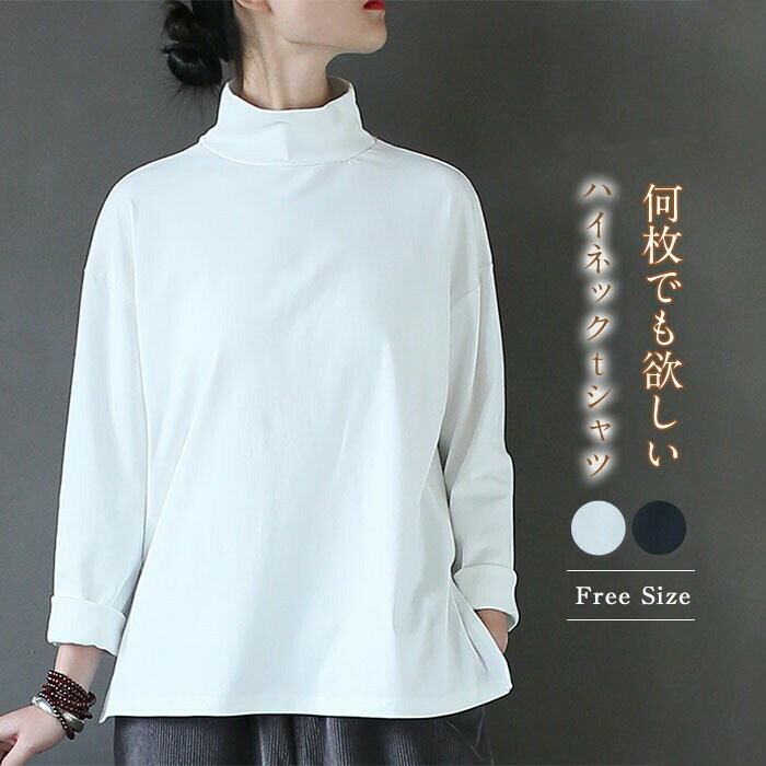 ハイネック tシャツ レディース 長袖tシャツ スリット カットソー プルオーバー オーバーサイズ 重ね着 長袖 大きいサイズ シンプル ゆったり 春 冬 着回し 定番 綿 秋