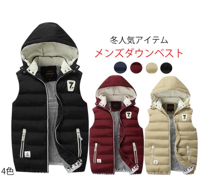 メンズダウンベスト 4色 チェック柄裏地 フード取り外し可能 紳士服 中綿ベスト 綿いりベスト 大きいサイズ ミリタリージャケット 防寒着 カジュアル アウター 秋冬