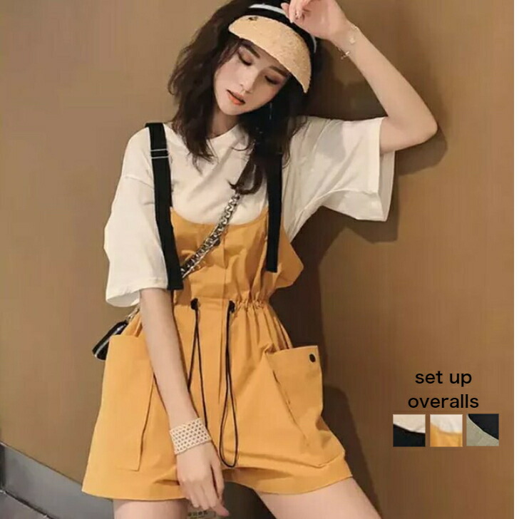オーバーオール サロペット Tシャツ セットアップ 上下セット 中学生 高校生 学生 韓国 半ズボン 短パン 通学 レディース かわいい おしゃれ 10代 春 夏 秋 20代