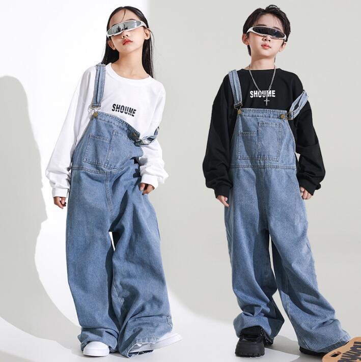 子供デニムサロペット キッズヒップホップダンス衣装 デニム オーバーオール ゆったり ダボる ジーンズ 男女兼用 デニムパンツ ダンス サロペット 長袖シャツ 110-180